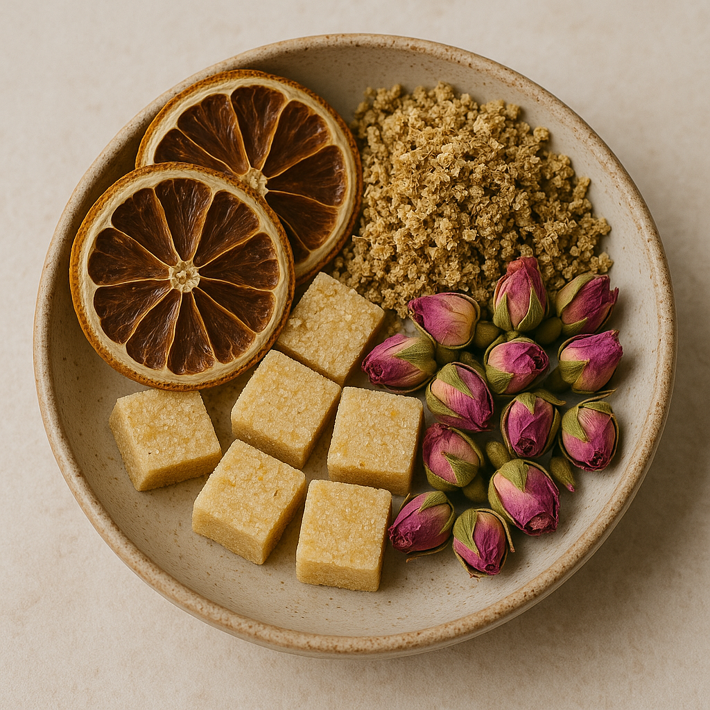 Ingredients: Dried Lemons, Elderflower, Rose buds & Lemon infused organic sugar