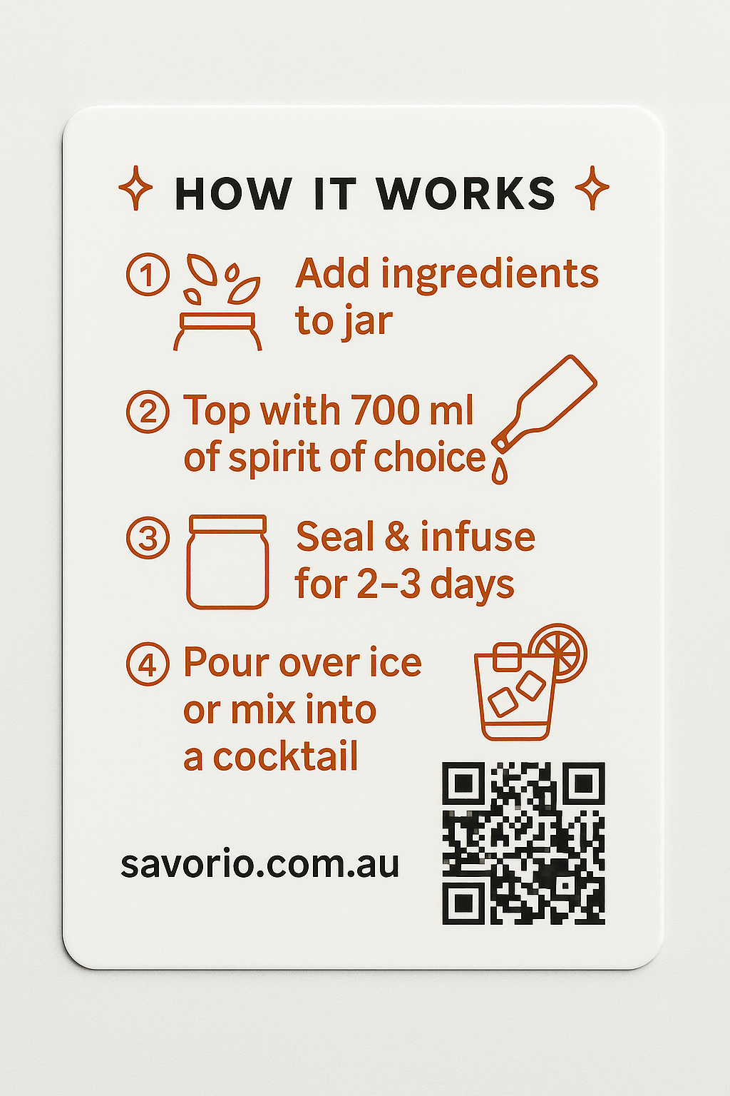 *Once infused and strained, your alcohol can be stored in a sealed glass bottle for up to 3 months in a cool, dark place or in the fridge for maximum freshness.