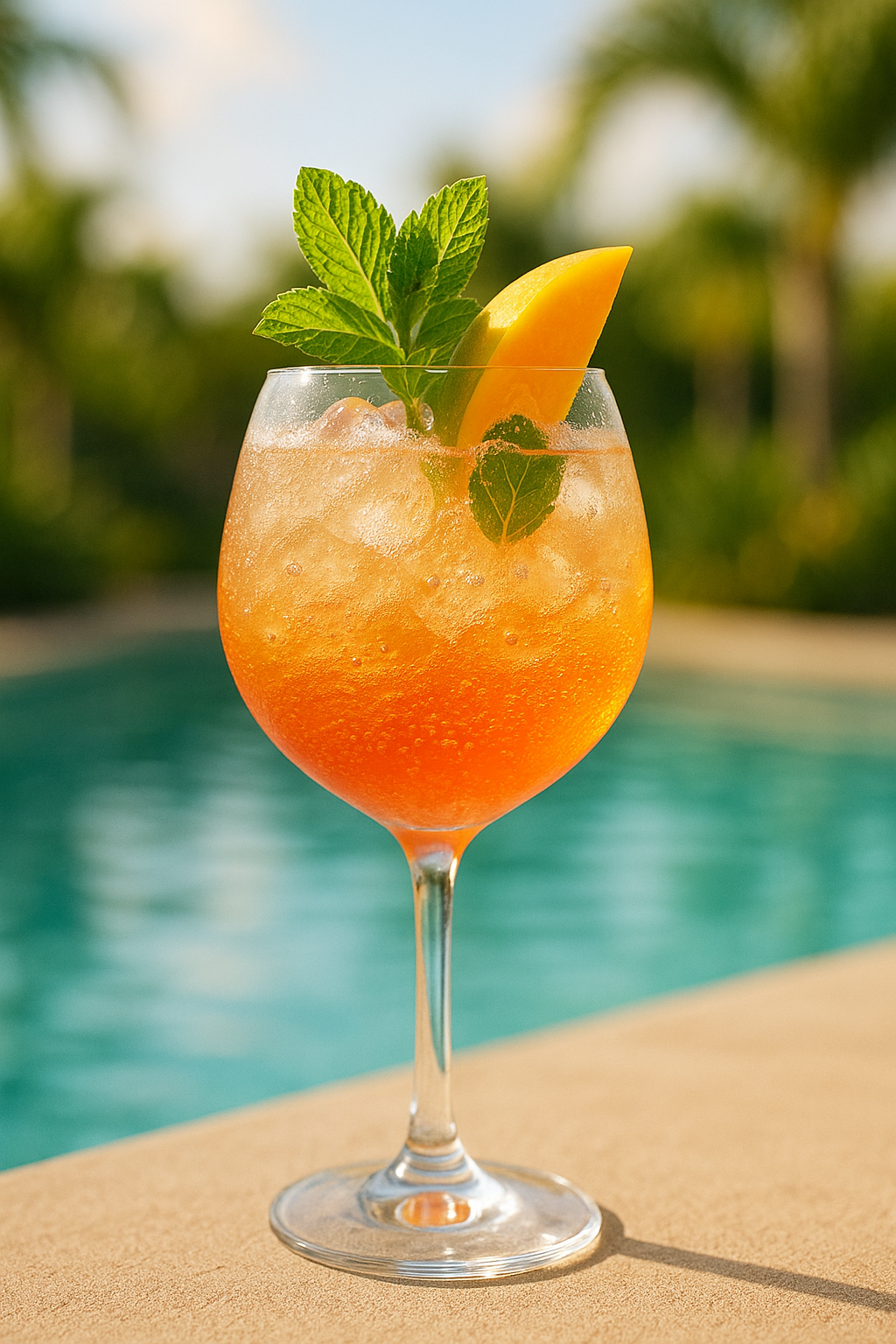 - Garnish with a mango wedge and a sprig of mint
