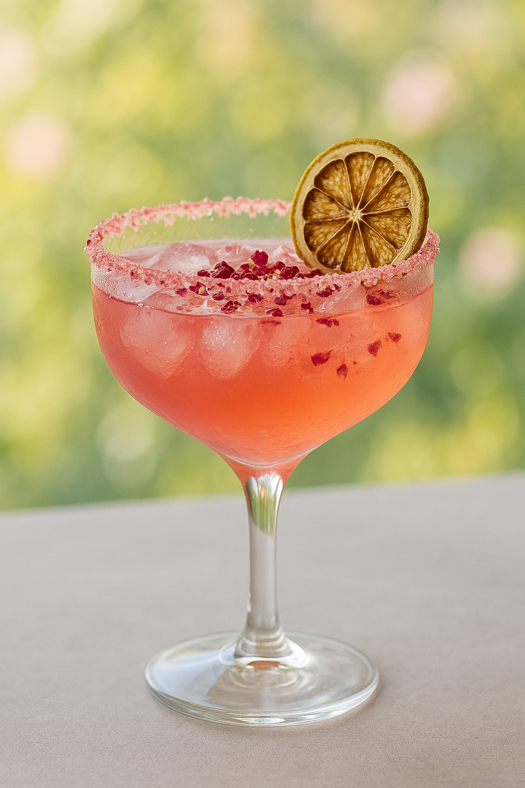 - Garnish with a dried lemon wheel and a pinch of crushed rose petals